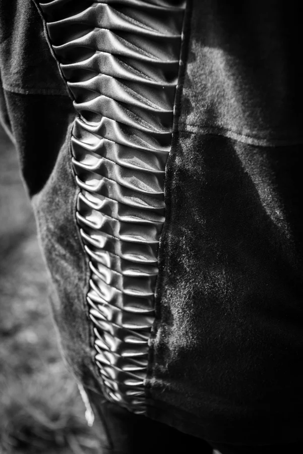- The base is made from denim fabric, with a synthetic lining. Ribs and spine are crafted from leather.