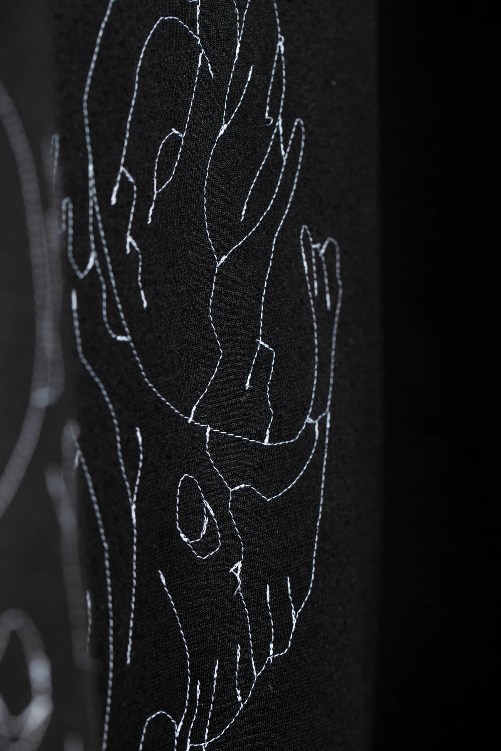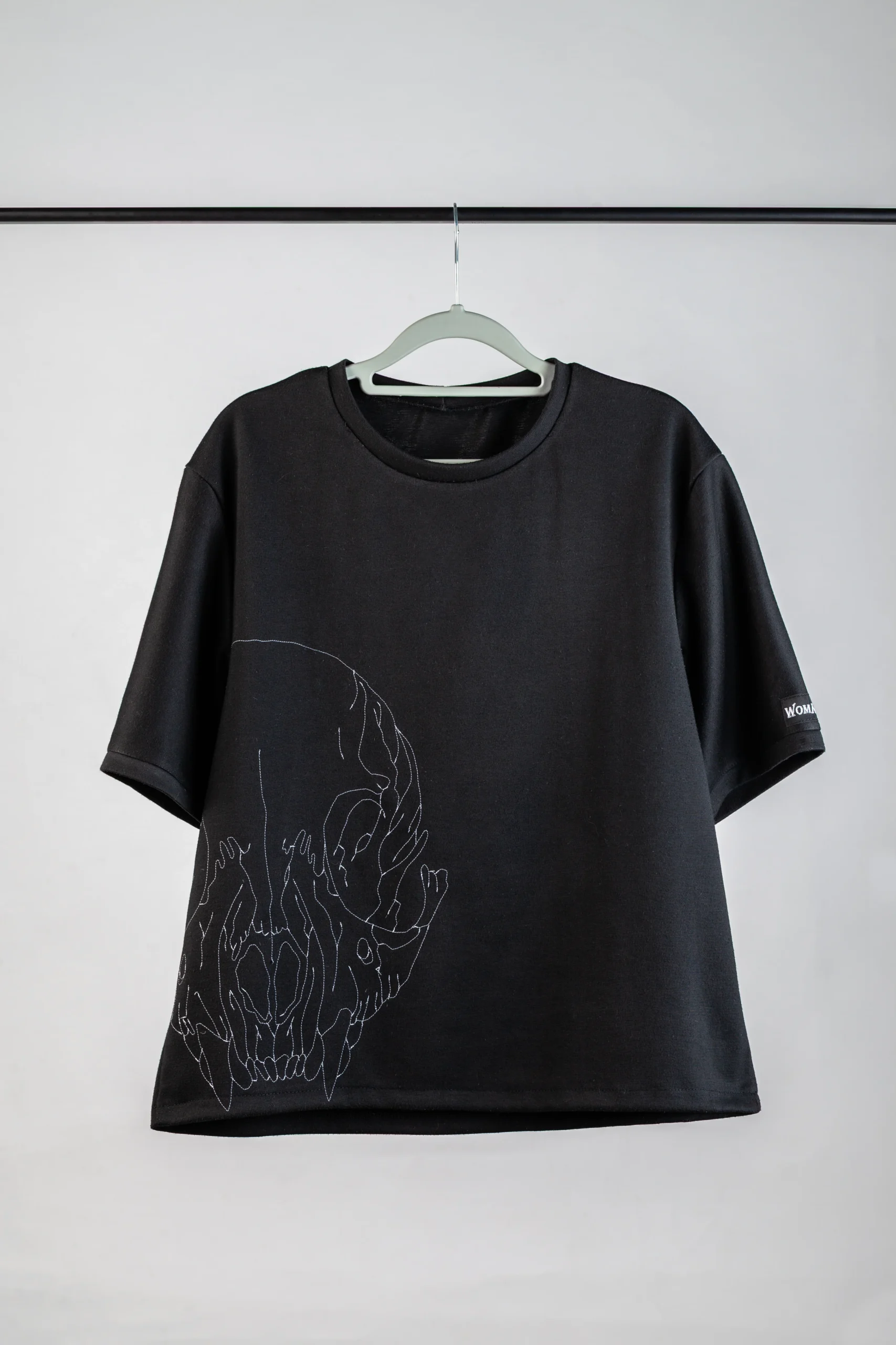 Stitched bat skull on the left side using white thread